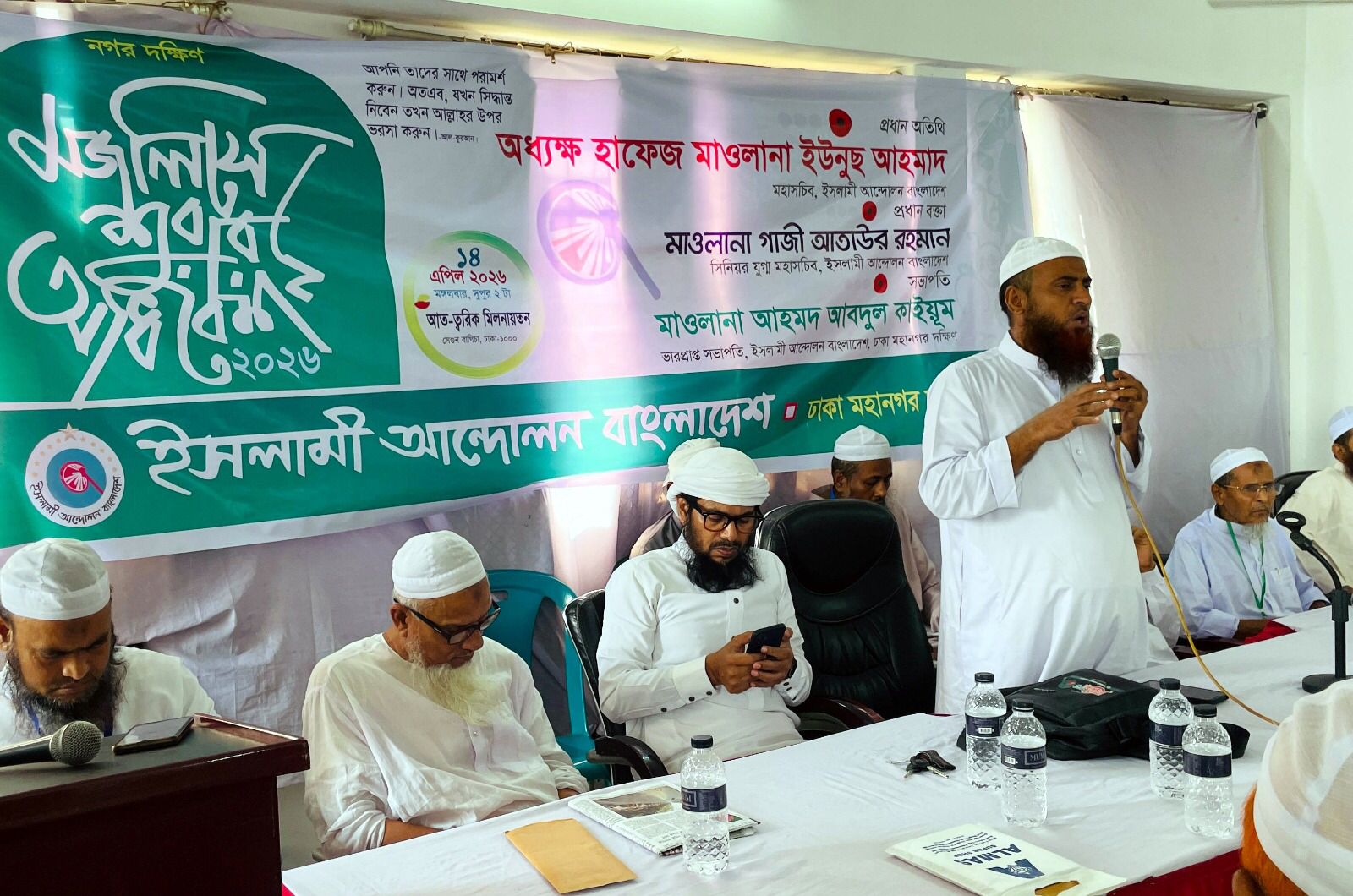 আজ ১৪ এপ্রিল মঙ্গলবার ইসলামী আন্দোলন বাংলাদেশ ঢাকা মহানগর দক্ষিণ এর মজলিসে শূরার অধিবেশনে তিনি এসব কথা বলেন। দলের ঢাকা মহানগর দক্ষিণের ভারপ্রাপ্ত সভাপতি মাওলানা আহমদ আবদুল কাইয়ূমের সভাপতিত্বে এবং সেক্রেটারী মো. আব্দুল আউয়ালের সঞ্চালনায় অনুষ্ঠিত শুরা অধিবেশনে বিশেষ অতিথি ছিলেন দলের কেন্দ্রীয় সাংগঠনিক সম্পাদক শাহ ইফতেখার তারিক ও ঢাকা বিভাগীয় সাংগঠনিক সম্পাদক মাওলানা দেলাওয়ার হোসাইন সাকী, জাতীয় শিক্ষক ফোরামের কেন্দ্রীয় সভাপতি অধ্যাপক নাছির উদ্দীন খান, ইসলামী মুক্তিযোদ্ধা পরিষদের সভাপতি বীর মুক্তিযোদ্ধা আবুল কাশেম।