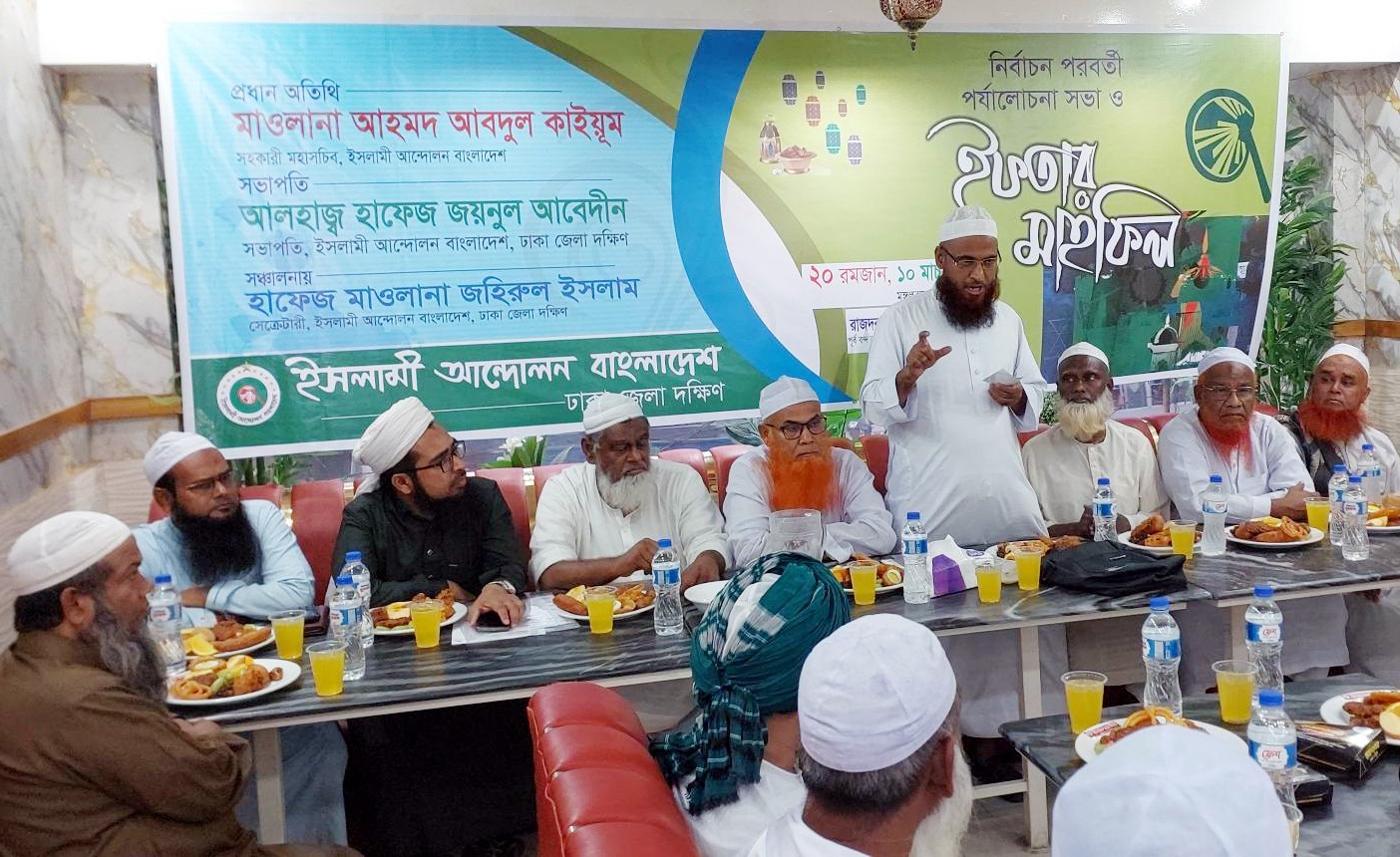 মঙ্গলবার রাজধানীর কেরাণীগঞ্জের কদমতলী চৌরাস্তাস্থ রাজদরবার গ্র্যান্ড রেস্টুরেন্টে ইসলামী আন্দোলন বাংলাদেশ ঢাকা জেলা দক্ষিণ আয়োজিত নির্বাচন পরবর্তী পর্যালোচনা সভা ও ইফতার মাহফিলে প্রধান অতিথির বক্তব্যে তিনি এসব কথা বলেন। দলের ঢাকা জেলা দক্ষিণ সভাপতি আলহাজ্ব হাফেজ জয়নুল আবেদীনের সভাপতিত্বে এবং জয়েণ্ট সেক্রেটারী হাজী শাহীন আহমদের সঞ্চালনায় অনুষ্ঠিত আলোচনায় অংশনেন, হাজী মোহাম্মদ হানিফ মেম্বার, অধ্যাপক ডা. কামরুজ্জামান, হাফেজ মাওলানা জহিরুল ইসলাম, আলহাজ্ব সুলতান আহমদ খান, আলহাজ্ব শামীম খান, মাজহারুল ইসলাম রাশেদী, মাওলানা ইলিয়াস হোসাইন, জয়নুল আবদীন, যুবনেতা আলআমীন শাহাদাত, নূরে আলমসহ অন্যান্য নেতৃবৃন্দ।